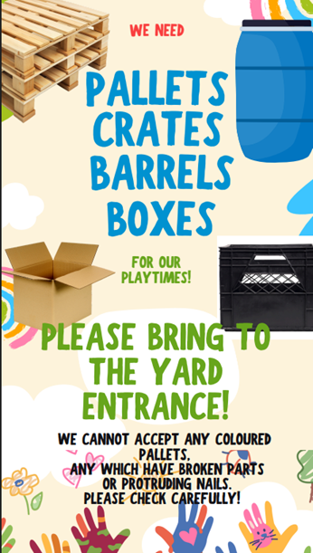 In addition to reading 'The Power of Playtimes Parents Guide', we are always looking for donations of loose parts. These are items which children can play with, such as boxes, barrels, crates, pipe, brooms, action figures, wood rounds, sticks, tarps, cones, containers. In fact, pretty much everything that is safe to be played with can be!