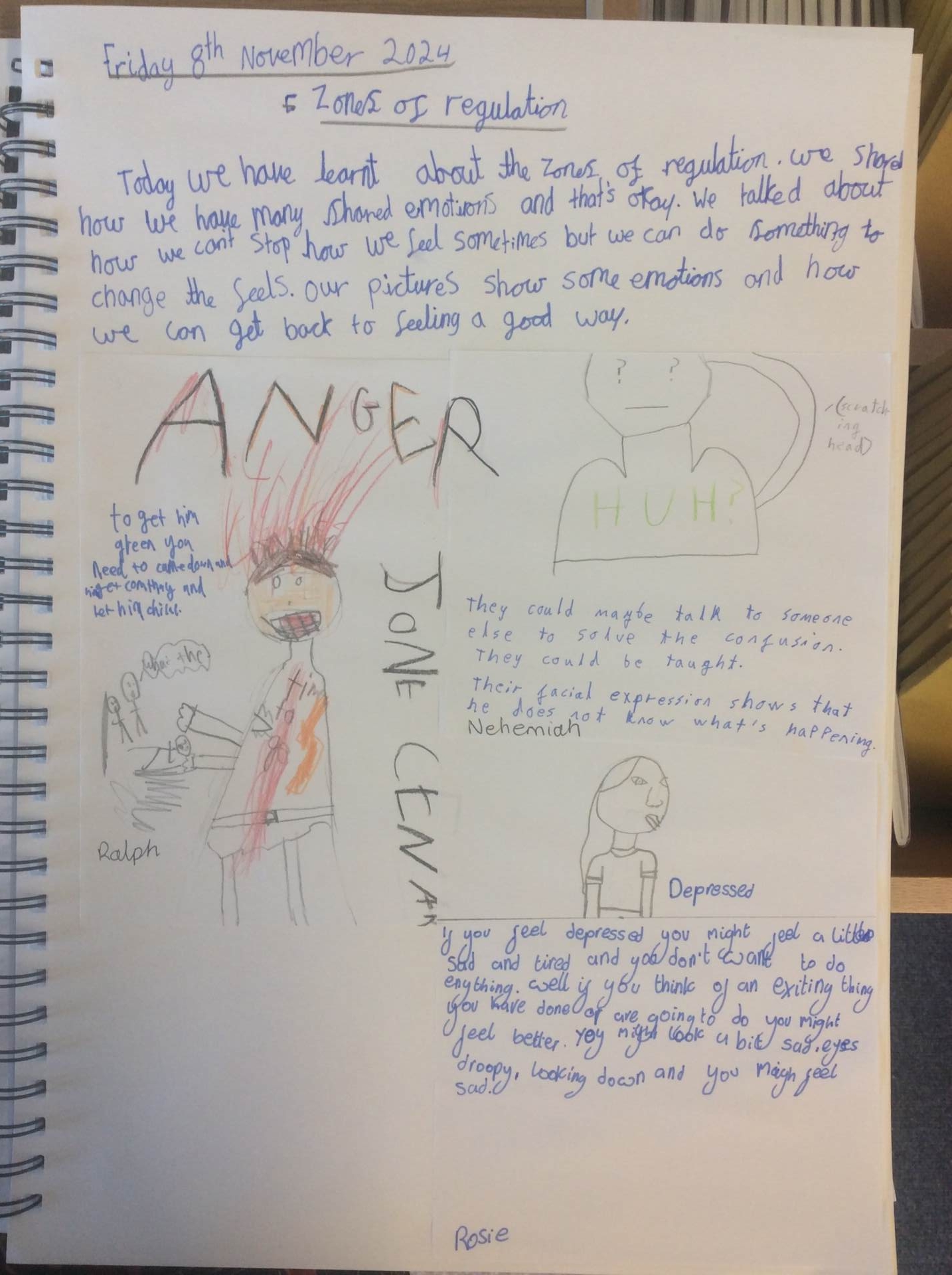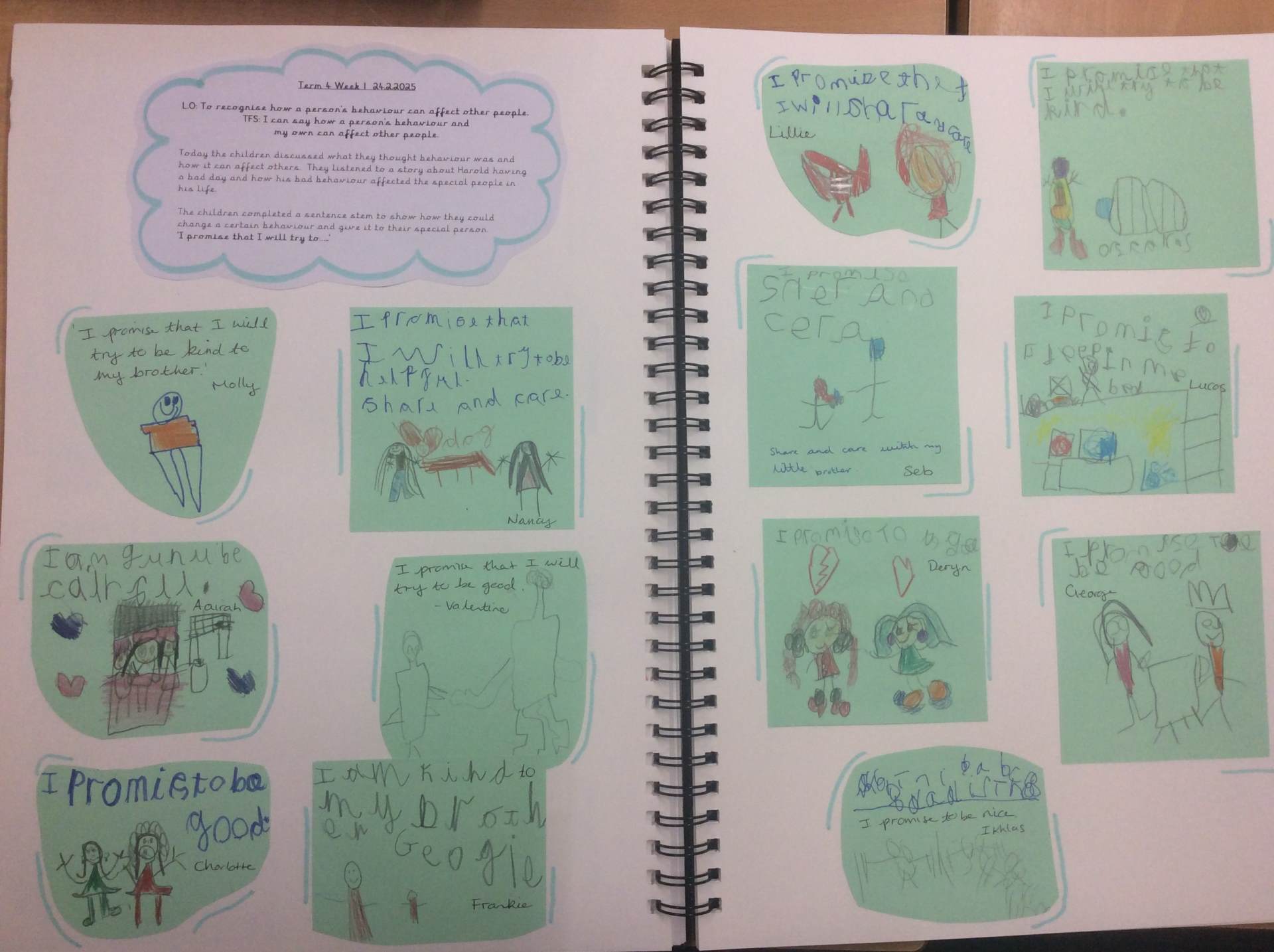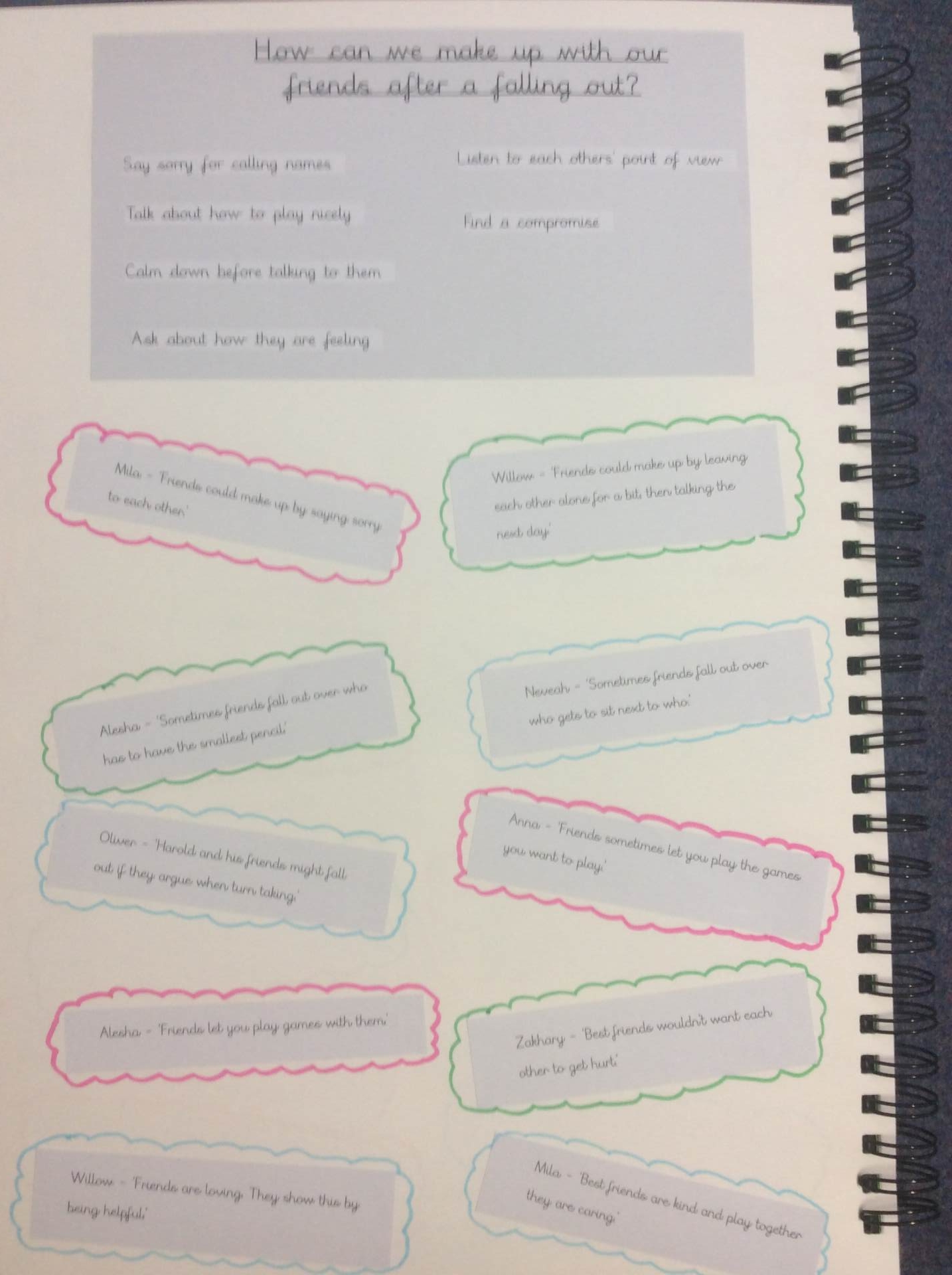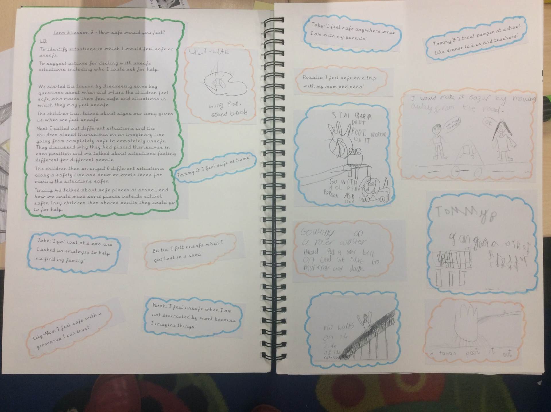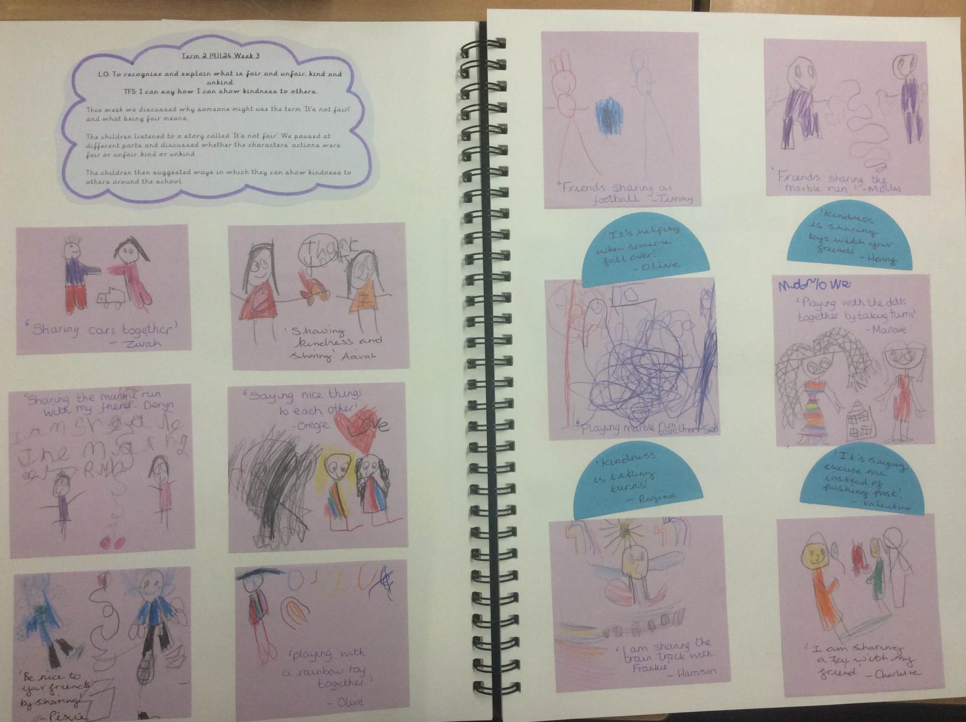 Pupils work is recorded in a class floor book, over the term all pupils will contribute to the book through the work, pupil voice, photos etc. These books will travel with the children as they move to the next year group, in order for pupils to reflect on their learning and the next teacher to see the class’ starting points, ensuring specific needs are met. Assessment for learning opportunities are built into each unit, which enables self evaluation, and allows teachers to evaluate and assess progress through contributions made by children to class discussions and work in the class floor book.