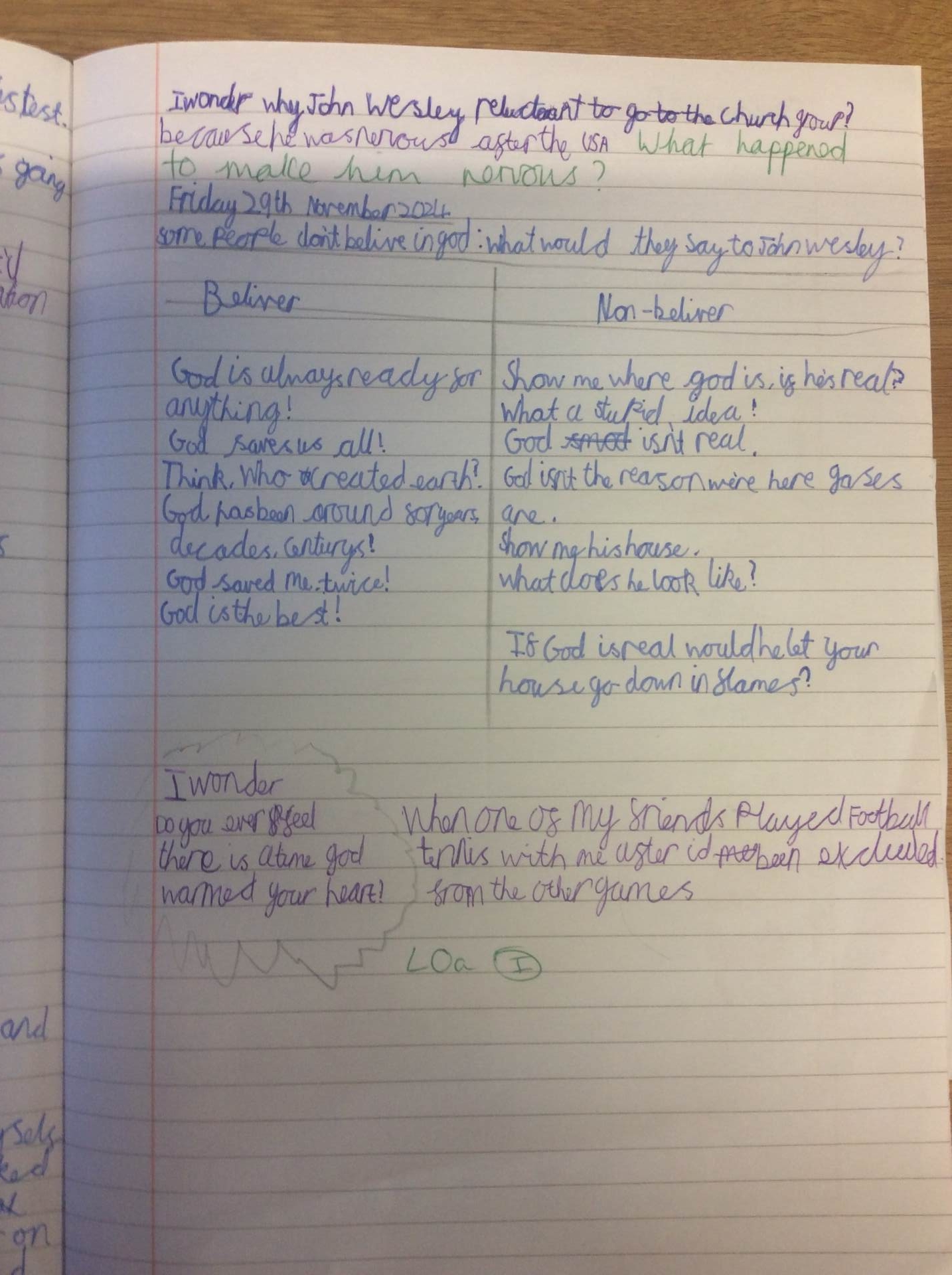 The children at The John Wesley CEM Primary School enjoying learning about faiths and why people choose, or choose not to follow a religion. Through their R.E. learning, the children are able to make links between their own lives and those of others in their community and in the wider world. R.E. acts as a hub, therefore, between social aspects of learning, science and geography. Through R.E. our children are developing an understanding of other people’s cultures and ways of life, which they are then able to communicate to the wider community. R.E. also offers our children opportunities to ask why, how and ‘I wonder’ questions and to present arguments and debate topics important to them in a safe and respectful environment.