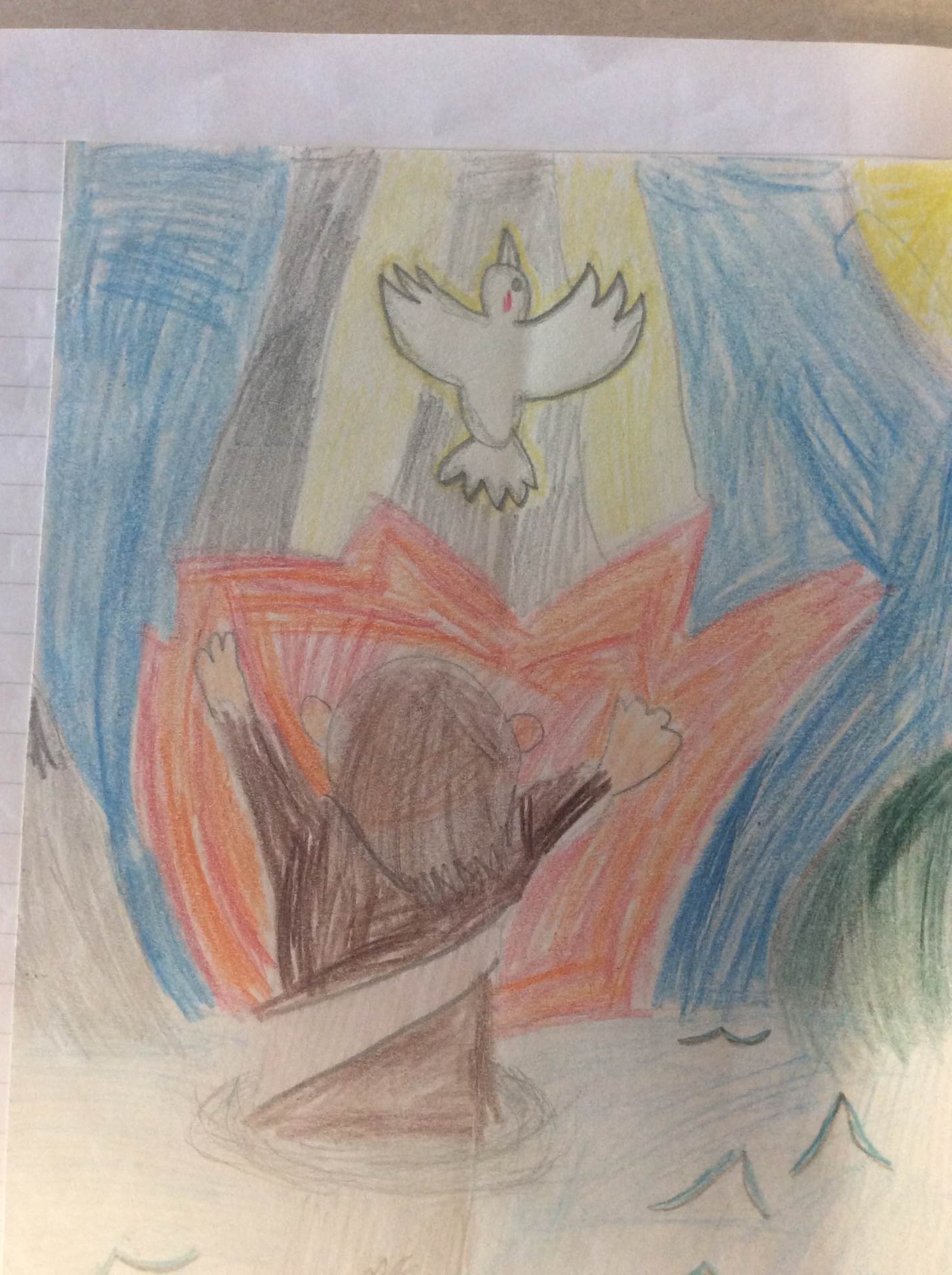 This wall frieze is the called ‘The Big Frieze’ it is designed by the artist Emma Yarlett to illustrate seven of the concepts that are explored in Understanding Christianity. It represents the ‘big story’ of the Bible and used to help teach the Christianity units in the school. The images represent Creation, Fall, People of God, Incarnation, Gospel, Salvation and Kingdom of God.